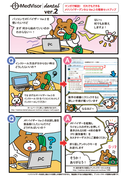 歯科医院で利用されるシステムの導入部分を、マンガで分かりやすくして欲しい、とのご依頼でしたので、A4両面に、動物のキャラクターを登場させあえてゆるい感じにし、内容も分かりやすく制作したことで大変喜んでいただけました。